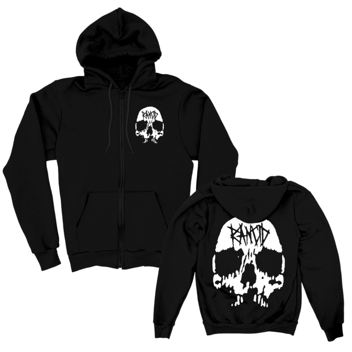 The Rancid Skull Logo on a black, standard-fitting black hoodie. Small print on front chest with larger print on back.
